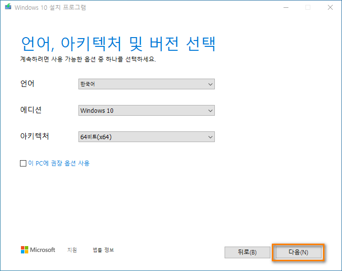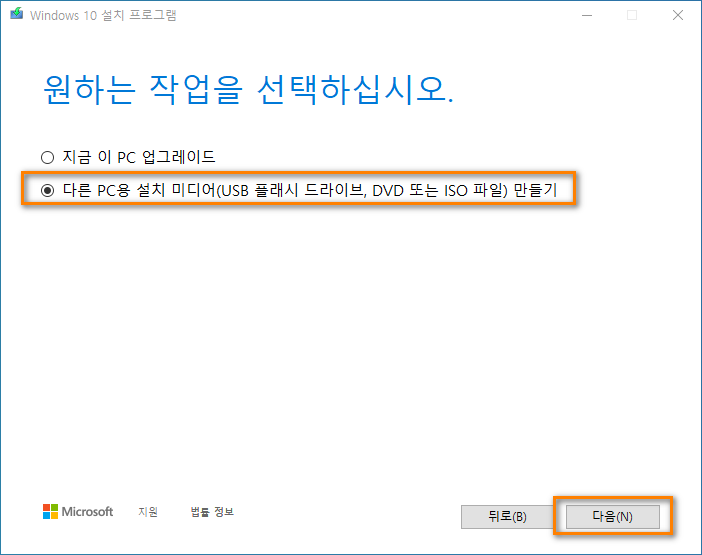우: USB를 꼽으면 옵션이 자동으로 설정됩니다. 윈도우10 설치 이미지를 마운트 해야 합니다.