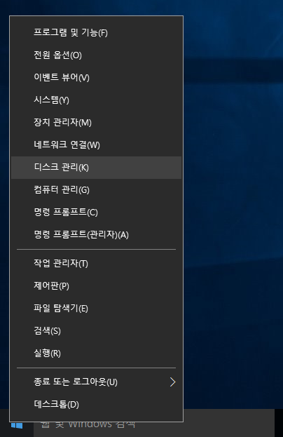 [ 시작 버튼 - 마우스 우클릭 ] 또는 [ Windows 버튼 + X ]