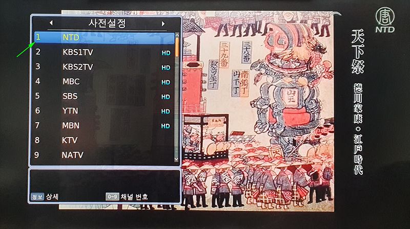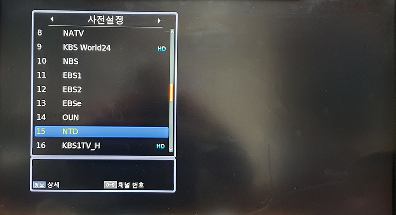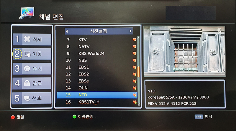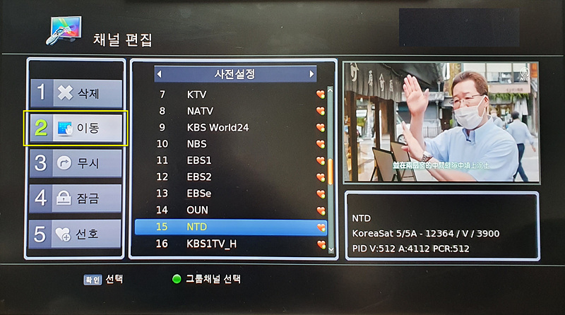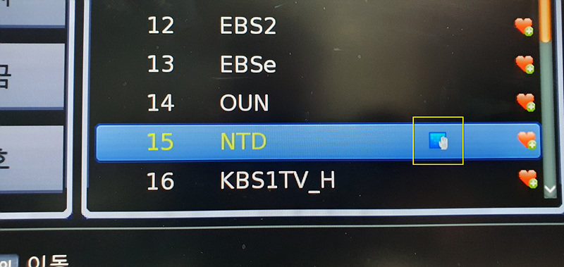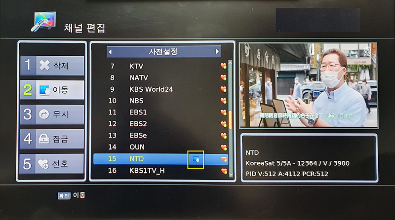 15번인 NTD TV 채널을 1번 채널로 이동해 보겠습니다.
