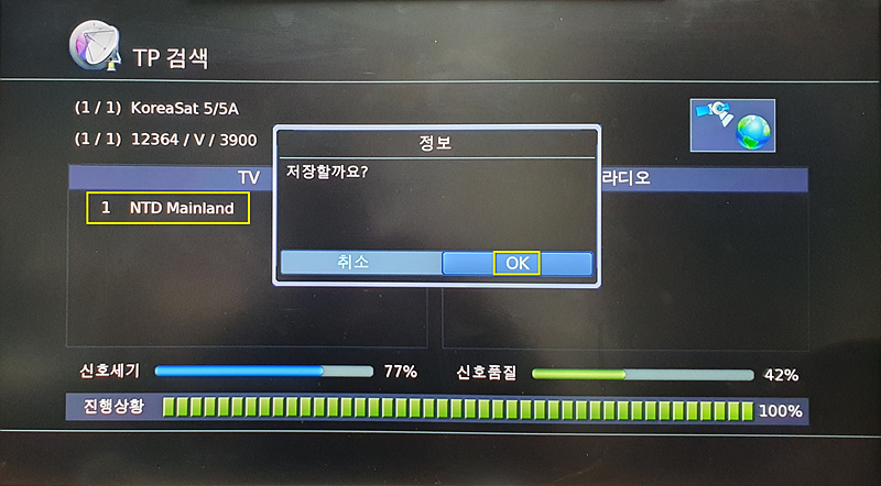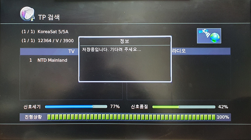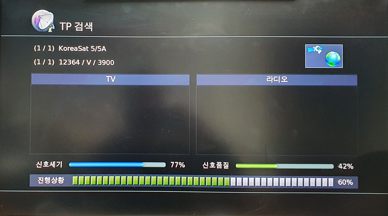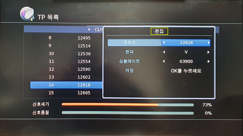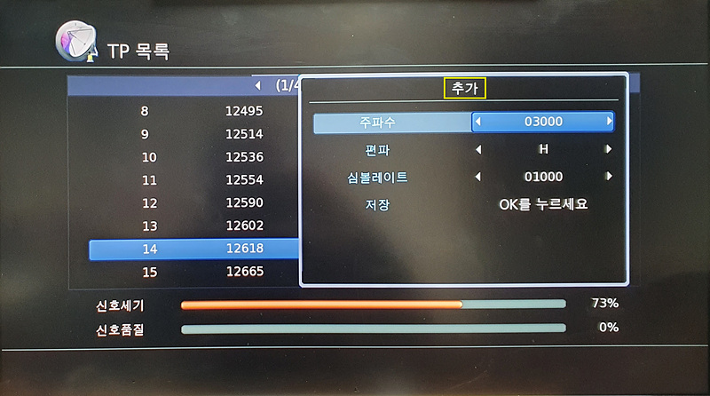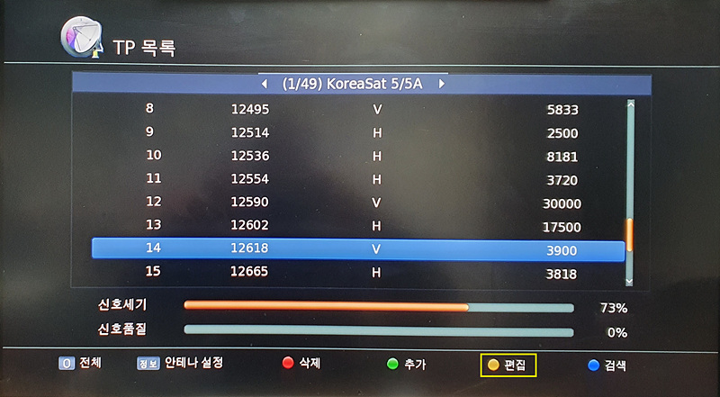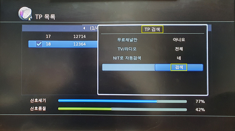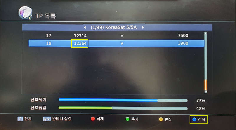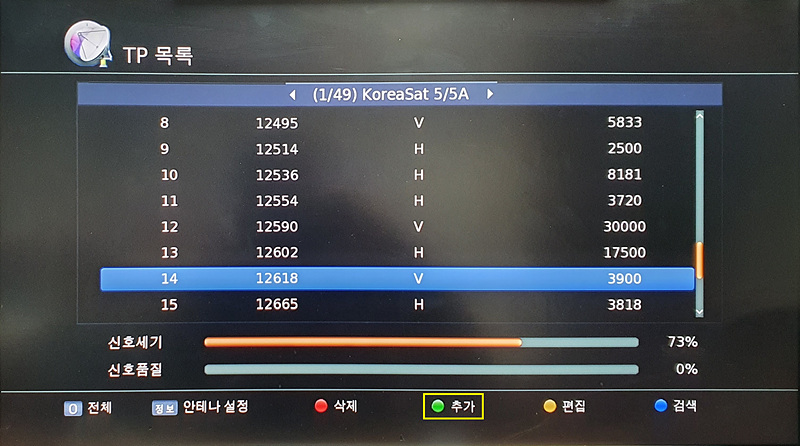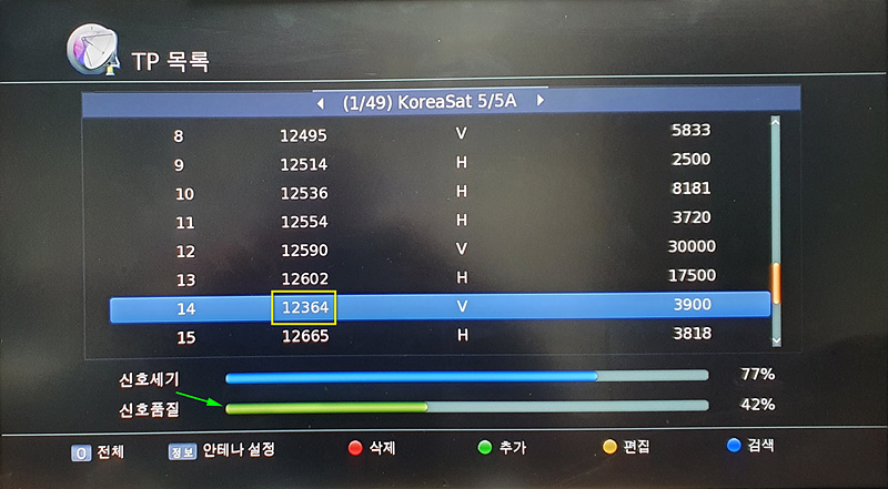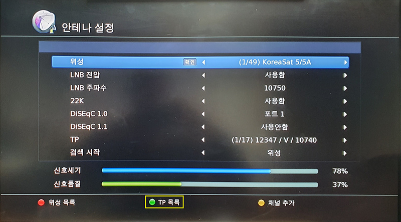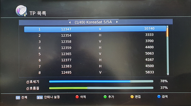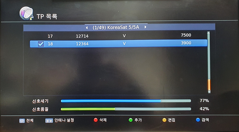 TP목록에 새 중계기가 등록되면 중계기 검색을 위해 리모컨의 파랑 기능키를 누릅니다. [아래 신호품질이 살아난 것을 확인하세요]