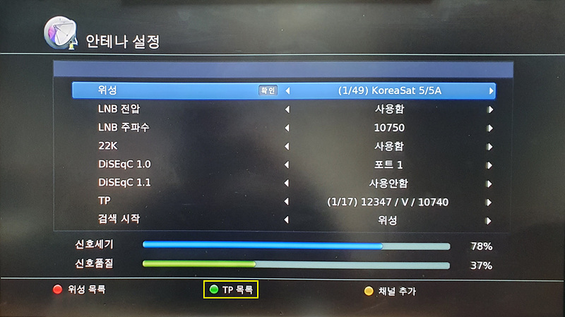 안테나 설정 메뉴에서 하단의 TP목록 이동을 위해 리모컨의 초록 기능키를 누릅니다.