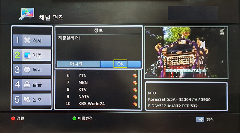 채널 편집 메뉴에서 OK(확인) 버튼을 누릅니다.
