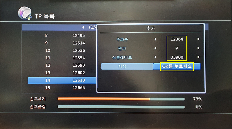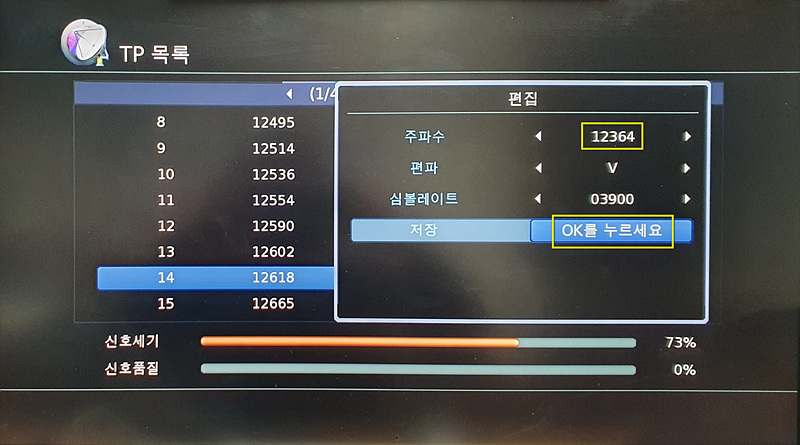 주파수 칸에 리모컨의 숫자 버튼을 이용하여 12364 를 입력 후 OK(확인) 버튼을 누릅니다.